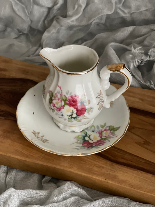 Royal Crown 1147 Gray & Pink Flowers, Gold Floral Creamer and Saucer